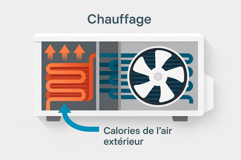 En hiver : elle capte les calories de l'air extérieur (même par temps froid) pour les restituer à l'intérieur (fonction de chauffage).