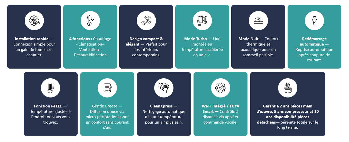 Cette innovation permet de rafraîchir ou chauffer efficacement sans inconfort thermique, pour un bien-être optimal à tout moment de la journée.