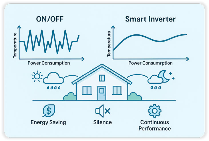 La technologie SmartInverter intégrée à la gamme Riviera permet d’ajuster en temps réel la vitesse du compresseur en fonction de la température souhaitée.