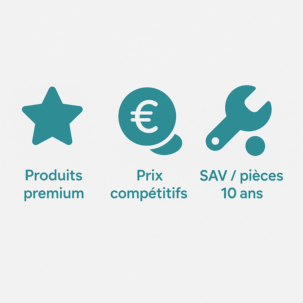 C’est pourquoi nous ne travaillons qu’avec des fabricants réputés, aux standards de qualité élevés, avec une politique de disponibilité des pièces détachées sur 10 ans minimum pour assurer la réparabilité et la durabilité de vos installations.